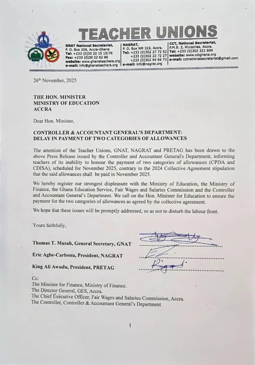 The major teacher unions; GNAT, NAGRAT and PRETAG, have expressed strong displeasure after the Controller and Accountant-General’s Department (CAGD) announced a delay in the payment of two teacher allowances: the Continuous Professional Development Allowance (CPDA) and the Digital Support Allowance (DSA).